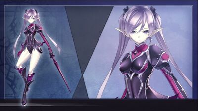 Mervina is a young Syrium women at silghtly below average height, with an slender body build, her race's pale skin tone, long ears with a silver earring on the right, long ankle-length lavender hair done up in two pigtails held by black hair scrunchies, a bang near her left eye, and her eye color is light purple. Her main battle is dark purple form-fitting leather bodyshirt, the armor has many design of lavender lines on it, and magenta on the underside of the sleeves, on the shoulders, the underbreast area, and neckcloth. She wear palatinate purple stockings that reach her knees and are slightly torn at the top, and dark purple knee-length boots.