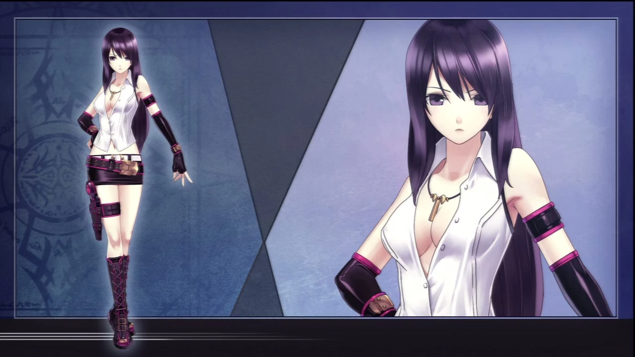 Vanessa is a woman of average height, with a slender body build, an fair complexion, black, waist length hair with an purple sheen, and eyes of the same color. Her attire is mostly an white blouse, with first three of the five button undone exposing her cleavage, an simple necklace, black elbow-length, fingerless leather gloves, and three armband, two on her right arm, and one on her left. She wear a leather miniskirt with an white belt and a thick black leather gun belt for one of the holsters for her guns, an leg holster for her second gun, and black, knee-length combat boots.